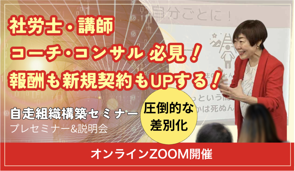 つまり、わたしが15年以上かけ、100社以上に導入し、自走組織に導いた、確立した自走組織構築のエッセンスを、90分でお伝えするセミナーです。